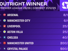 英超夺冠赔率:阿森纳、曼城前二,维拉升至并列第三